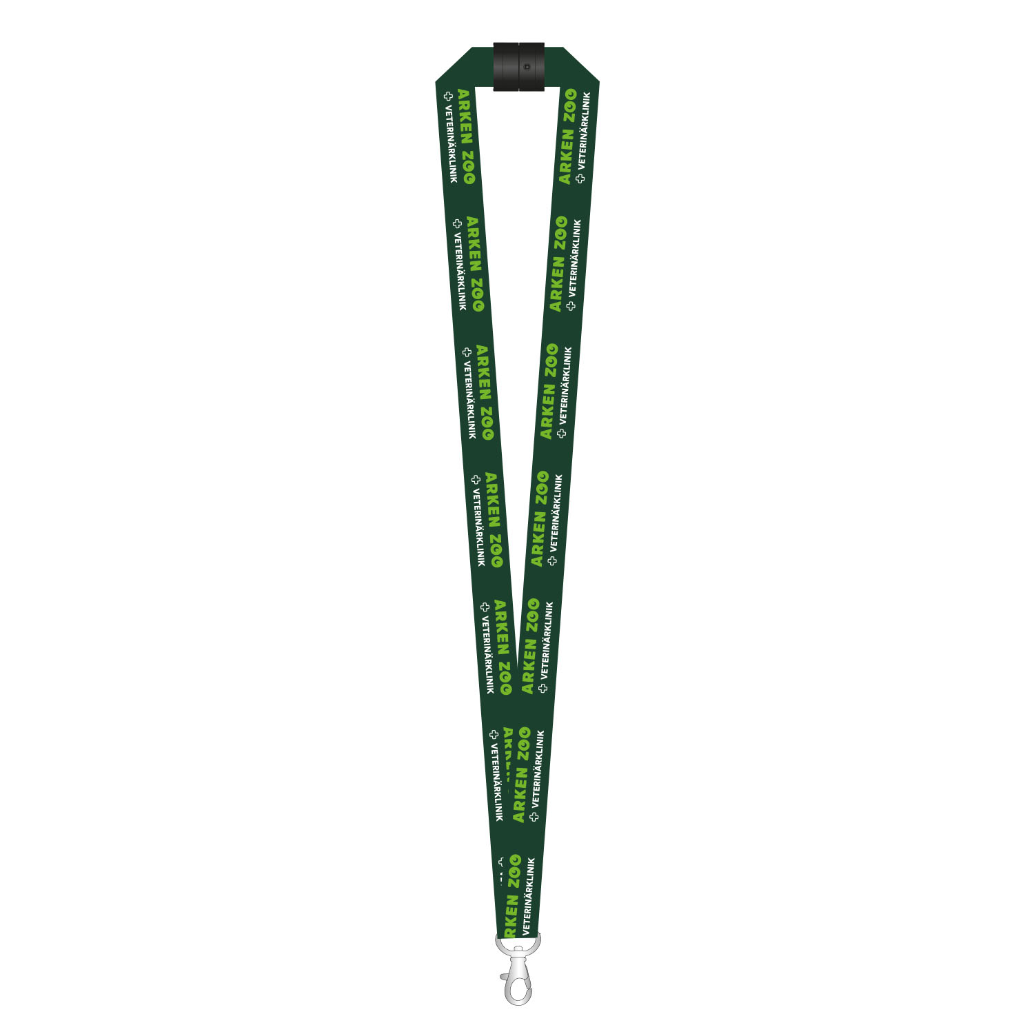 Grönt logoband med karbinhake och säkerhetsspänne.